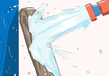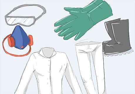 Use appropriate safety equipment. This is usually listed on the warning and usage label for each specific product, and the following are some common items. Safety glasses. These keep chemicals or dust from getting in the applicator's eyes. Rubber gloves. Rubber, neoprene, or other chemical resistant gloves protect your hands from chemicals which may be absorbed through your skin. Long sleeved shirts and long pants. Another barrier protection for your skin. When the application process is complete, remove clothing and rinse it thoroughly before laundering. Rubber boots. Because leather or cloth boots can absorb and accumulate chemicals, it is often suggested that the person applying pesticides wear rubber boots.