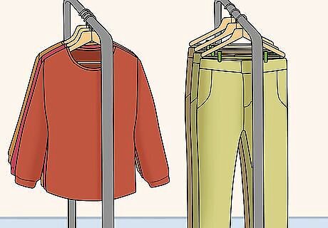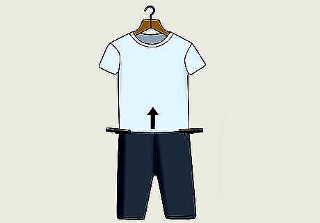 Use clothespins to hang baby and children's items. You don’t need to use special baby-sized hangers that hold baby outfits together. Instead, use clothespins to attach pants, shorts, and skirts to their corresponding onesies or shirts on the hangers. You can pin the pants to the bottom of the shirt or to the hanger itself so they hang just below the shirt.