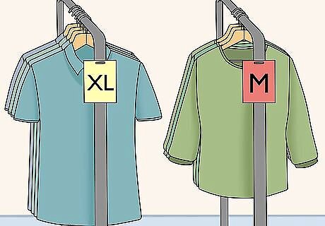 Organize the clothes by size if you have many different sizes. If you’re selling a large variety of clothes with many different sizes, displaying them organized by size can help people navigate the items. Hang similarly sized clothes near each other so people can more easily identify the sections. For example, you can hang T-shirts of the same size together, even if they’re different colors or styles.