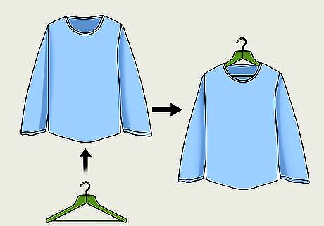 Insert hangers through the bottom of shirts. Slide the hanger through the bottom of the shirt or blouse and thread it through the opening at the top. Don’t put the shirt or blouse on the hanger by sticking it through the neck hole because that can stretch it out. People are less likely to purchase a shirt or blouse from your garage sale if it’s stretched or warped.