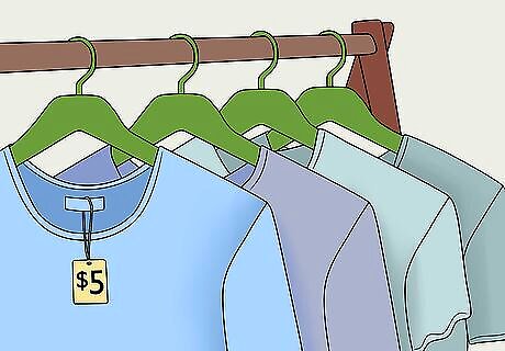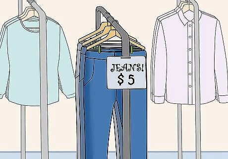 Price each item appropriately. Your clothing needs to be priced well enough for people to want to buy the used items. You can label each item with a price or you can price sections of clothes. Clothes made by a well-known and quality name brand should still be priced reasonably so people are more likely to buy them. For example, you could say that all pants are $4. Baby clothes in good condition should be priced between $1 and $3, while adult clothes with little wear and tear should be priced between $3 and $5. If the clothes are really out of style, reduce the price so people are more likely to buy them and take them off your hands. Sell clothes that are older and worn but don’t have any damage for $1 to encourage people to purchase them.