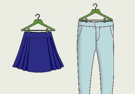 Clip skirts, shorts, and pants to the hanger at the waist. Use hangers with clips for shorts and pants so they’re easily visible when you hang them at your garage sale. Secure them to the hanger by clipping them along the waistband. If the skirt, shorts, or pants have a larger waistband than the length of the hanger, fold them in half and clip the waistband. Place a piece of a napkin or tissue paper between the clips and the item to protect embellishments like embroidery or beading.Tip: If you don’t have hangers with clips on them, fold the skirt, pants, or shorts over the central bar of the hanger.