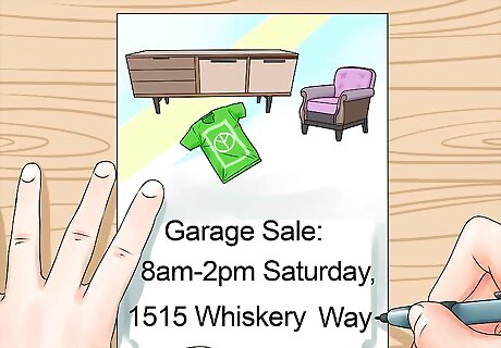 Make signs a few days before the sale. Give the date and time of the sale, the location and, if you have room, list some items for sale. The signs can be as simple as "Garage Sale: 8 a.m. - 2 p.m on Saturday at 1515 Whiskery Way", or "Yard Sale Saturday: 1515 Whiskery Way" with an arrow pointing down the street toward your house. Try to find a balance of information that's useful, fun, and easy to read from a moving vehicle. Make sure that the phrase "Garage Sale" or "Yard Sale" is prominent. Use plain, bold colors and simple lettering when conveying your garage sale's information. Use a sturdy material for your garage sale signs, like a couple of layers of poster board or corrugated cardboard, so that the wind won't bend it.