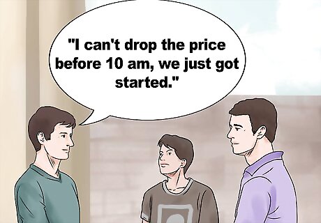 Negotiate with hagglers. Even though your prices are clearly marked, some people will try to haggle. Play along; haggling can be a fun experience, and you’ll likely make a lot more sales if you’re willing to reward these bargain hunters. Don’t be afraid to decline an offer that considers all offers. After all, you’re trying to get rid of this stuff. Be sure not to drop your prices too early in the day. If you've successfully organized your garage sale, you should bring in plenty of customers that are willing to pay the full price. If you're having a multi-family sale, haggling on friends' items should only be done with their permission. If a customer isn't willing to compromise on their low-ball offer, say, "It's not mine. I'm selling this for a friend, so I have to stick with their price for you and the other buyers".