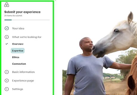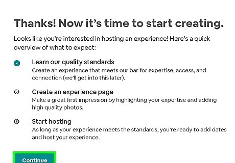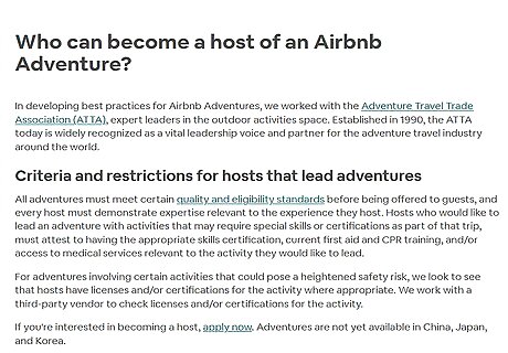 Submit your adventure through your Airbnb account. When you go onto Airbnb’s Adventures page, click the “host” button at the top to begin registering your adventure. You will be asked to detail your adventure, including its location, length, and a brief description of what it is about. There is also room to put your name, email address, and any relevant certifications you have. To access the form directly, go to https://www.airbnb.com/d/host-an-adventure. If you aren’t already logged in, Airbnb will ask you to sign up for an account when you try to submit your adventure. Type in your name and email address to quickly set up a new account. Expect a delay before Airbnb approves your listing. It can take several weeks. During this time, the company makes sure your adventure fits their guidelines. Airbnb's guidelines state that a knowledgeable, passionate host leads hands-on, immersive activities. Adventures have to be unique and display the host's personal perspective.
