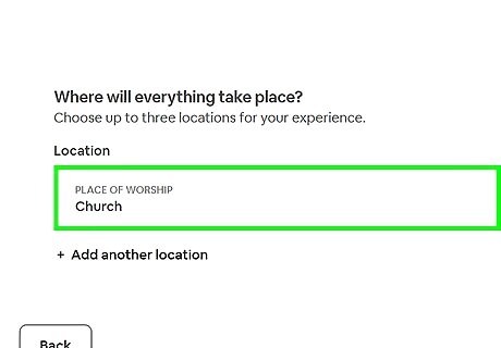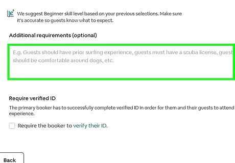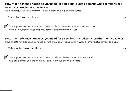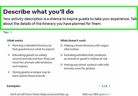 Include cancellations and other policies at the bottom of the page. Type the information into the last section on your profile page. At the bottom, you will see a bunch of boxes for things like the cancellation policy, communication policy, guest requirements, and alcohol policy. Give an accurate description of each policy in the relevant section. These policies are up to you, so make them up according to what you are willing to allow on your adventure as well as any relevant local regulations. List as much information as you can to let readers know what they are getting into before they book your adventure. One simple way to list the cancellation policy is, “Refunds are available within 24 hours of purchase.” Note if guests are allowed to bring other people with them. Many adventures have to be carefully planned and paid for, so it isn’t always an option. You may also wish to restrict children from attending, especially if alcohol will be served or if the activity level will be too high for them. Fill out the tips section with helpful information that doesn’t fit elsewhere. You could mention what forms of identification guests need to bring or remind them that airfare isn’t included.
