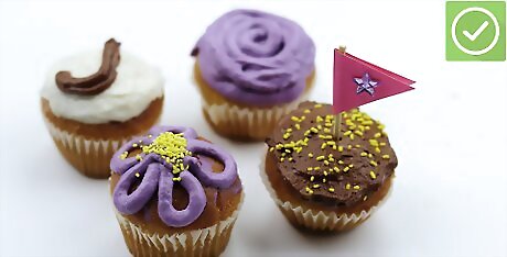 Make cupcake flags. Draw hearts, flowers or other designs on pieces of thick paper, then cut them out and tape them to the top section of toothpicks. Stick them in the cupcakes to serve as festive "flags."