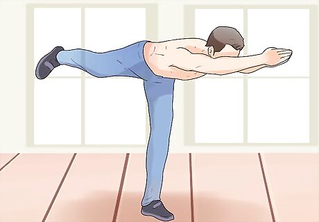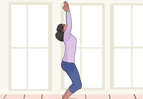 Focus your mind with warrior pose. Like eagle pose, warrior pose also relies on the strength of many muscles in your body. In addition, it requires you to maintain your balance and focus on continually contracting muscles to maintain the proper posture. Start by standing straight up with your feet hip-width apart. Your arms should hang gently at your side. Step your left leg forward about 4-5 feet (almost like you're starting a lunge). Turn your toes of your right foot out away from your body at about a 45 degree angle. Lower down, like a lunge, so your left thigh is almost parallel to the floor. As you lower down, sweep your arms upwards over your head with palms facing each other. Your arms should be straight, however elbows shouldn't be locked. Arch your back slightly and look up towards your hands that are over your head. Squeeze your buttocks and leg muscles to help you balance and hold this position. To square your hips toward the front of the mat, roll your back thigh up and open and press down through your back pinkie toe. Stay here for at least 30 seconds. Breathe in out and deeply as you hold this position.