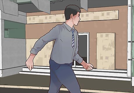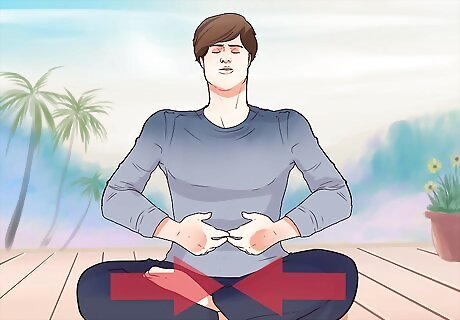 Relax into chair pose. Chair pose can help you focus on your body instead of your mind. It engages multiple muscles. Start chair pose by standing tall with feet hip-width apart. Keep your arms down by your side, relaxed, with your palms facing inwards. Slowly lower down as if you were about to sit down into a chair. Keep bending until your thighs are almost parallel to the floor. Squeeze your knees together and keep your weight in your heels. Lean your torso forward slightly while keep your back straight. Tuck your pelvis under to engage your core muscles and knit your ribcage together while lifting up through the chest. Sweep your arms upward so your elbows are tracking near your ears. Your arms should remain straight with palms facing inward toward each other. Lower your shoulders to avoid creating tension in your neck. Hold this pose for at least 30 seconds. Continue to breathe deeply as you hold this pose.