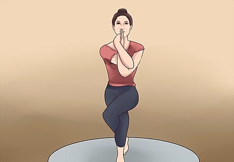 Stand tall in eagle pose. Eagle pose is great for strengthening your body and the connection between your mind and body. It relies on balance and forces you to concentrate on maintaining your balance, rather than focusing on your mental stress, and therefore relaxes your mind. Start eagle pose by standing straight with your feet hip-width apart. Keep your arms by your sides with your palms facing inwards. Slowly bend your knees (almost as if you were getting into chair pose) and then while focusing straight in front of you, lift your right leg up and over your bent left leg. Your right leg should rest just above the knee on your left leg. Try to bring the top of your right foot behind your left calf. It should be somewhat "hooked" behind your lower left leg. Bring your arms in front of you. Bend your arms so that your upper arm is parallel to the floor and your forearm is perpendicular to the floor. Hook your right arm underneath your left arm. Your elbows should almost be right on top of each other. Or, stretch through your upper back by wrapping your right arm underneath your lap and reaching for the left shoulder blade. Turn your hands so your palms are facing towards each other. Place your palms together flat against each other. Hold this position for at least 30 seconds or as long as you can hold it or maintain your balance. Keep your core engaged, square your hips toward the front of the mat, and sink deeper into your bent leg. Continue to breathe deeply while holding this position.