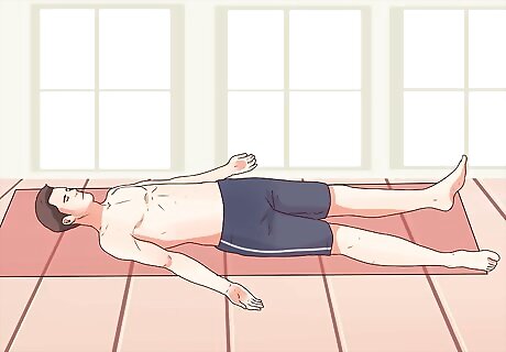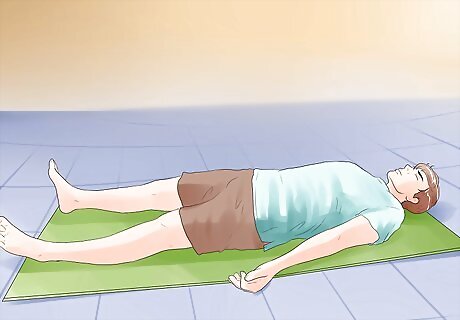 End with corpse pose. Most yoga sessions end with corpse pose. Although one of the easiest poses to do physically, it requires a lot of mental concentration and meditation to be able to perform correctly. Lay flat on the floor on your back. Keep your head straight with eyes forward. Try to relax all the joints and muscles in your body. Position your legs so your toes fall out away from your body. Position your legs slightly wider than hip-width apart. Turn your palms upwards with your fingers pointing away from your body. Your arms can be at a 45-degree angle from your torso, close to your sides. While inhaling and exhaling deeply, focus on relaxing one part of the body or one muscle at a time. Try to keep your mind clear and focus on your relationship with relaxation. Hold this position for at least 5 minutes but you can stay here up to 10 minutes if you'd like.