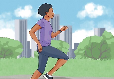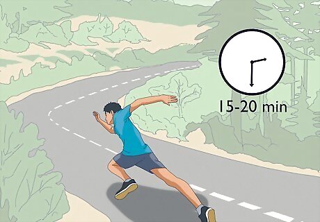 Work out for longer periods at a moderate intensity. Instead of going all out for a short amount of time, focus on going for a longer amount of time at a lower intensity. By training for longer periods of time, you'll have a better baseline to increase, which makes improving your stamina already much easier. For example, instead of sprinting hard for 5 minutes, you can go for a 15-20 minute jog.