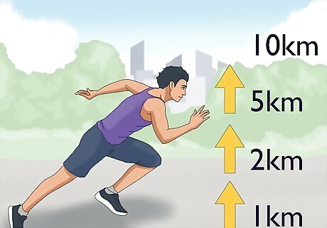 Build up to your target level of stamina gradually. Any attempt to improve your stamina through exercise should be approached somewhat gradually - try to do too much too early, and you may exhaust yourself or give up. Instead, set simple, specific goals as stepping stones to your major goal, like first running 1 kilometer, then, in two weeks, 2 kilometers (1.2 mi), then 5 kilometers (3.1 mi), and finally 10 kilometers (6.2 mi). Celebrate each milestone you reach as an achievement. Build up: Don't give up! For cardiovascular exercise, start out slowly, mildly increasing your heart rate and maintaining that heart rate for no more than 30 minutes the first time. Increase the intensity and duration of your performance by small, realistic intervals until you reach your goal. Within a few months, you'll likely have made serious improvement while barely noticing the change! For strength-building exercise, begin at a weight or resistance level that's easily manageable. Add only a few small weights to your barbell or exercise machine. Alternatively, if you're doing a bodyweight exercise, you can usually modify the exercise to make it easier in some way - dropping your legs to make a push up easier or doing a crunch instead of a sit-up, for instance. Gradually increase the weight, resistance, or intensity of your exercise to smoothly build strength over time.