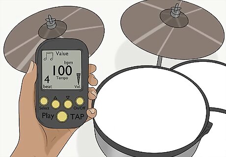 Practice playing with a metronome or other timekeeping machine. It is the drummer’s responsibility to keep the time of the songs that the band is playing. Use a metronome, drum machine, or click track while you practice to learn how to keep time. You can also practice playing along to professionally recorded songs to make learning how to keep time more interesting. Pick some of your favorite band’s tracks and play along to them to practice playing in time with them.