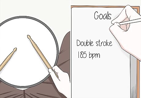 Set achievable goals for each practice session and keep track of them. Keep a progress journal of your practice sessions and log your goals in it. This will help you keep track of your problem areas and help you move from practicing what you already know to trying out different routines. For example, you could set a goal of playing rudiments at different tempos. In 1 practice session you could play a double stroke roll at 185 bpm, and in another at 180 bpm. Your goals can be very simple and don’t have to be hard. The important thing is that you have a purpose and focus on practicing specific things in each session so you keep improving every time.