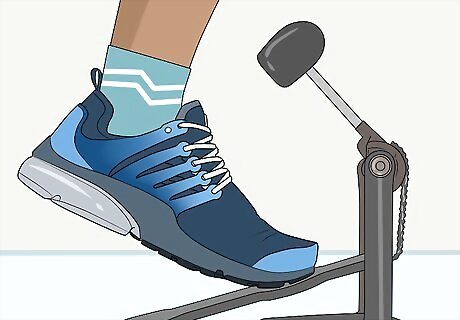 Practice the heel-toe technique to increase your bass drum speed. Raise your heel up from the bass pedal, then throw it down as hard as you can, which will automatically make your toes play a second note. This lets you play fast complex bass drum patterns, such as double stroke rolls, with ease. Practice this technique slowly at first to build it into your muscle memory, then gradually speed it up. Practice it separately with both your right foot and left foot.