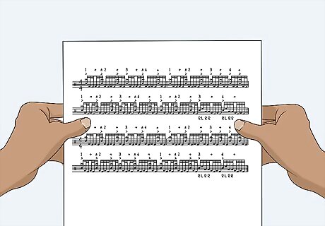 Master the basic rudiments before you try to develop your own style. Practice and master basic drum rudiments like the single (RLRL LRLR) and double stroke rolls (RRLL LLRR). Other basic rudiments to work on are the paradiddle (LRLL RLRR) and five-stroke roll (2 double strokes and a single stroke). Incorporate these into your practice routine, even if it feels monotonous, because perfecting your basics is key to helping you play more complex beats. The more you practice these basic rudiments, the more you will build them into your muscle memory so you’ll be able to play them without thinking.