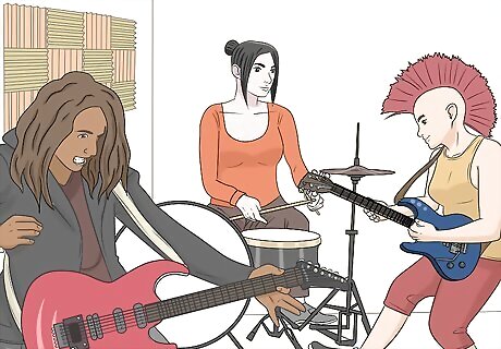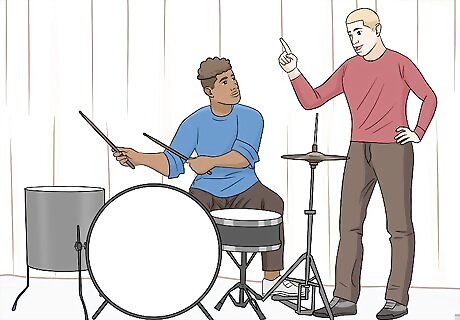 Play with other musicians and ask them to give you feedback. You don’t have to be in a band to play with other musicians. Ask any musician friends you have to come jam with you, or just listen to you play and give you feedback. This is of great importance when you want to go from being a good drummer to a great drummer. Other musicians will give you invaluable tips and feedback that can help you improve and work on your personal style. Make sure to discuss ideas and get creative when you play with other musicians. This will allow you to discover and learn new drumming sounds and styles and develop your individual style. You can also just watch and listen to other drummers play to see how they execute certain techniques.