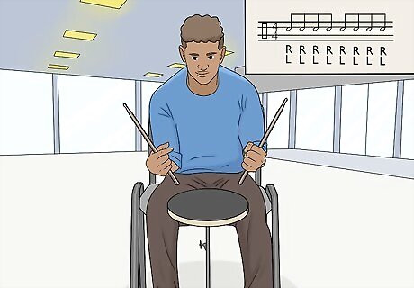 Take drumming lessons to learn the fundamentals. Find a local music school or drum teacher and sign up for classes to learn the basics. They will be able to teach you the fundamentals and provide you with some starting structure. If you can’t afford drum lessons or there aren’t any available in your area, then you can also find lots of video courses and lessons online for free or much cheaper than in-person lessons.