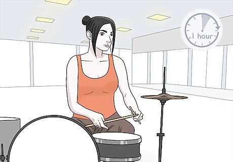 Set aside at least 1 hour of focused, solo practice time every day. Differentiate between your solo practice sessions and jam sessions. Focus on properly using techniques and on quality rather than quantity in your practice sessions. One hour of focused, disciplined, quality practice is better than 4 hours of aimless jamming. It allows you to work on and improve your techniques and practice the rudiments. A jam session, on the other hand, is an opportunity for you to apply the techniques that you have been working on in your practice sessions. Many drummers allocate a lot of time to jamming sessions, but hardly reserve time for focused solo practice sessions. Schedule different times for practice and for jamming to help you concentrate on developing your independent style, manage your speed, and have better control of your feet and sticks.