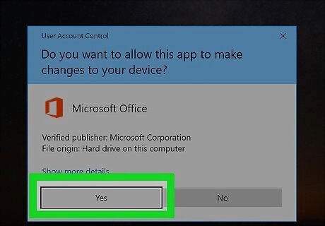 Click Yes when prompted. You may see a prompt asking “Do you want to allow this app to make changes to your device?” Selecting Yes will run the setup file and begin installing Office on your computer.