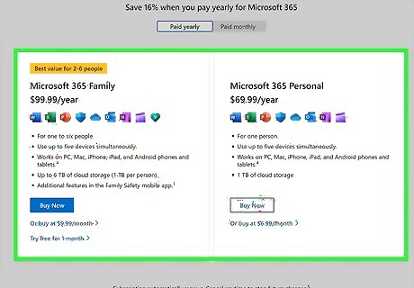 Select a plan. Click Buy Now to start the purchasing process for a subscription plan. There are a few options: Pay yearly or monthly. Select the Family plan if you have multiple users, or the Personal plan if it’s just for you.