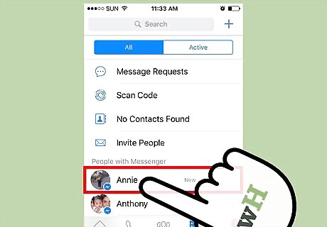 Tap a contact's name. This will open a conversation with that contact. You can also add people to this conversation by tapping your contact's name at the top of the chat window, then tapping "Create Group" and typing in the name of another contact.