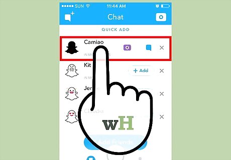 Swipe right on a contact's name. This will open a chat window with that contact; you can type an instant message from here. If you choose to take a picture/video, you'll need to tap the white arrow in the bottom right corner, tap a contact's name, and tap the white arrow again to send your media to them. You can also add text to photos/videos by tapping the screen after you take them.