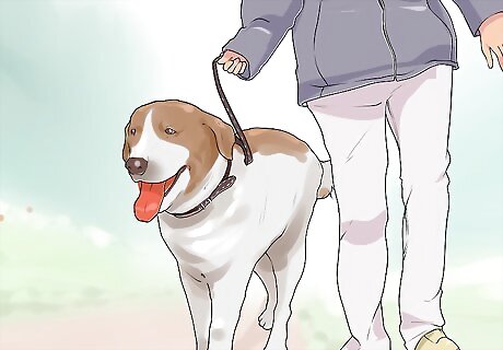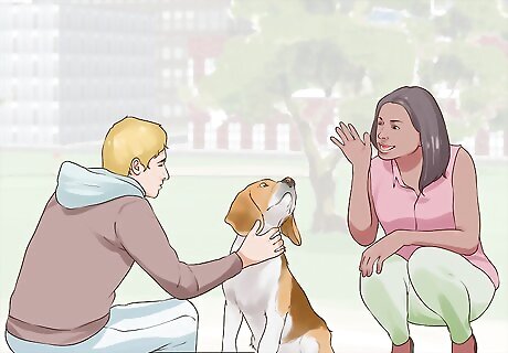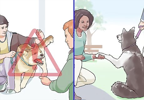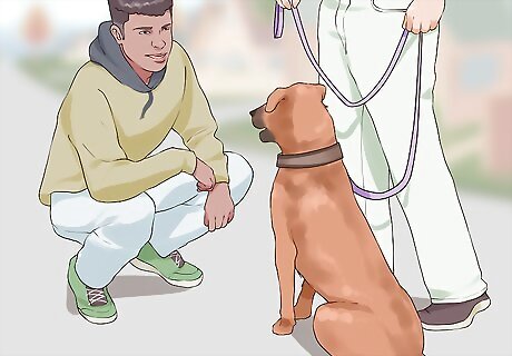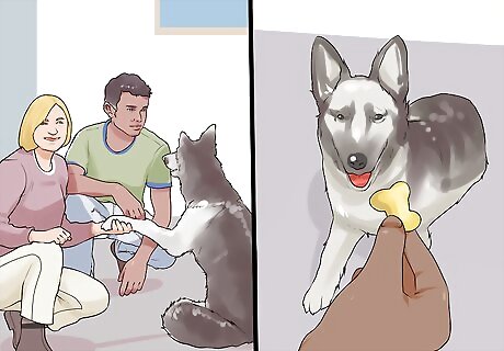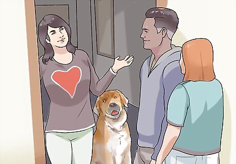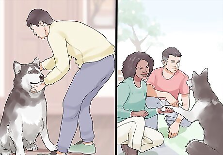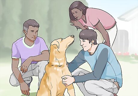 Promote friendliness with people. Part of training will be making sure that your dog is comfortable with people, including strangers. This is called "socialization." In order to do this you should lead by example, showing over-the-top kindness and joy when meeting people and showing affection. If your dog sees you welcoming new people, it is more likely to exhibit this behavior as well. Ideally, socialization should begin when a dog is a puppy. However, it is never too late to socialize a dog and make it comfortable meeting new people. Tell people that you are meeting up with or who are coming to your home about the situation. Make sure they model friendliness and joy with you and the dog. If you have a dog that has been trained to guard, then it will harder to get it to be friendly to strangers.
