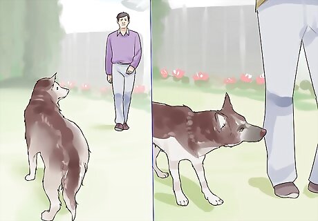 Allow the dog contact slowly. If your dog has a hard time meeting new people, you will need to take the interaction slowly. You will also want to make it possible for the dog to approach the neighbor, not the other way around. Your dog should first be given some time to see the neighbor from a distance. Then you should bring the dog close enough to smell the neighbor but not make contact. Then, if all is going well, you can allow physical contact. This usually includes the dog sniffing the neighbor. It can be a good idea to meet up with the neighbor while going for a walk. If the dog continues to move while the new person comes into their space, they are less likely to resist it.
