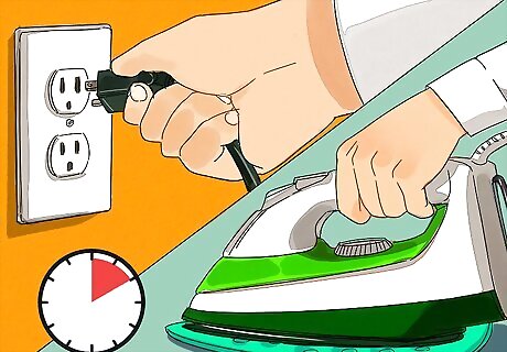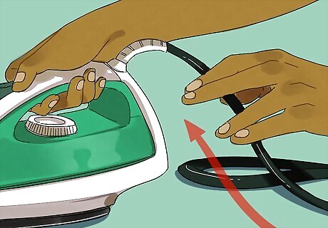Let your iron cool for at least ten minutes before putting it away. After you’ve ironed both sides of your garment, set your iron down on a secure surface. Carefully and gently follow the cord to locate where it’s plugged in, but make sure you don’t pull so hard that you knock over the iron. Unplug the iron, and let it cool for at least ten minutes before putting it away. You can wet your hand and splash it again, or quickly touch the iron with the back of your hand to make sure it’s cool enough to put away.