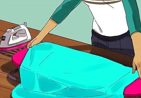 Heat your iron and lay out your clothing. Plug your iron in, set it on a secure surface where it won’t get knocked over, and wait for it to get hot. While you're waiting, you can set up your ironing board and lay out the article of clothing if you haven't already done so. You can tell the iron is ready by the subtle smell a hot iron makes. You can also wet your hand, splash a bit of water on the iron, and listen for a sizzle.
