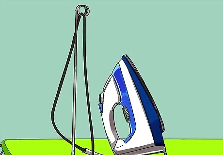 Use a cable holder to avoid losing track of the cord. An ironing cable holder is a device that clips onto an ironing board or table on one end and, with the other, holds the cord away from your work area. This will help you avoid knocking the ironing over, accidentally ironing over the cord, or setting the iron down on the cord, which may cause it to fall. The clips that hold the cord in place will also make it easier to locate the cord without pulling the iron off of a surface. You can find cord holders online or at a home goods store.