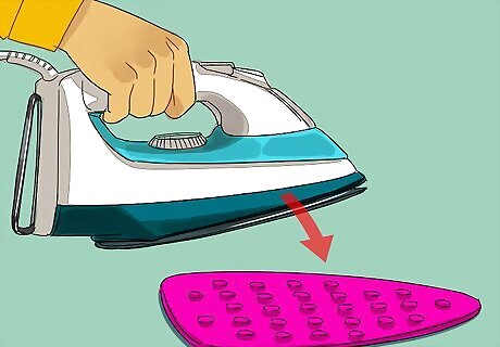 Rest the iron on a heat-proof pad. It’s preferable to set the iron down on a surface other than the iron board, especially if you’re using a more manageable tabletop board. A silicon-based or heavy terry cloth pad will help you avoid setting the hot iron down on a surface that’s prone to scorching. It will also help ensure the iron won’t get knocked over accidentally.