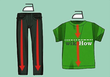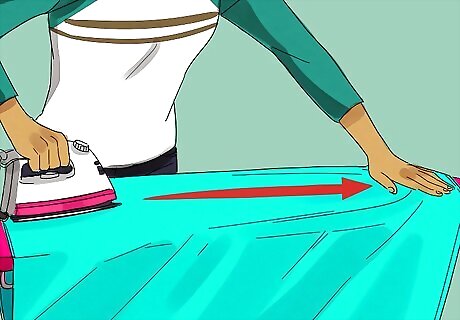 Use your hand to guide and flatten the material. When you’re ready to start ironing, hold the iron in your dominant hand. Use your other hand to flatten and guide the clothing item before the iron passes over it to avoid creating creases. Proceed in an even strip down the length of your garment. Take care to leave enough room between your guiding hand and the iron so you don’t get burned.