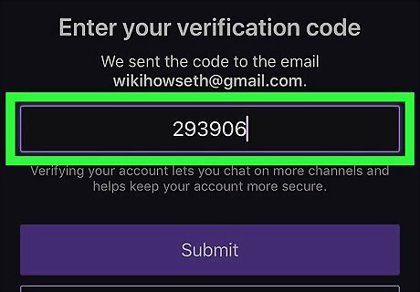 Enter the verification code from your email. Find the automated email message from Twitch in your mailbox, and enter the verification code in the app. Alternatively, you can tap Skip on the top-right, and proceed to your dashboard.