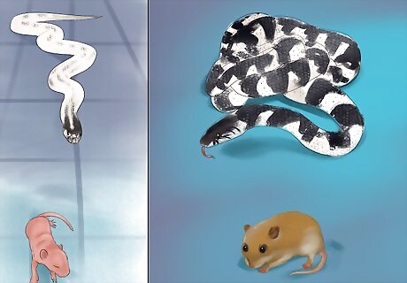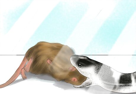 Feed your snake mice. Live mice are fine, but they’re not required, and they can often wound your snake. Freshly killed mice are the best choice, but if you want to freeze some for convenience, it’s okay to give your snake a very well-thawed one. One mouse per week will be enough, but if you want your snake to grow faster, you can give it up to two per week. Once they’re fully grown, in order to avoid obesity, you may need to cut back to once a week. When your snake is a baby, feed it newborn mice (about the size of your pinky). Increase the size of your mice as your snake grows. The largest adult snakes can often handle a small rat instead of multiple mice. You can usually buy mice at your local pet store, but you can also order them online.