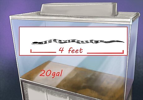 Buy a habitat. Choose a clear glass terrarium or similar container.Though California King Snakes usually only get about 4 feet long, some can reach an adult length of 6 feet, so you should get a habitat that can accommodate your snake at its largest possible size. If your snake lays around the edge of the tank and doesn’t cover more than 2/3 of the distance around the perimeter, the tank is probably big enough. Bigger is better. The more room you can give your snake to crawl around, the happier it will be. Most adults need about a 20-gallon enclosure or larger.
