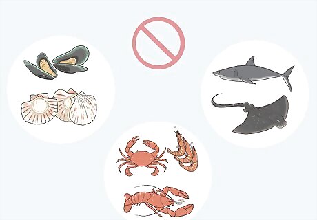 Do not eat shellfish or fish without scales. In the case of fish, there are several species that are not considered kosher and cannot be eaten. These include all shellfish including crab, lobster, shrimp, and oysters, in addition to fish without scales such as swordfish. This kosher law comes from a passage in Deuteronomy, Chapter 14:8-10: “These you may eat of all that are in the waters; all that have fins and scales, you may eat. But whatever does not have fins and scales, you shall not eat; it is unclean for you.” Some have speculated that the reason why shellfish are considered unclean is because many of them are “bottom dwellers” who live on the ocean floor as opposed to swimming in the cleaner waters.