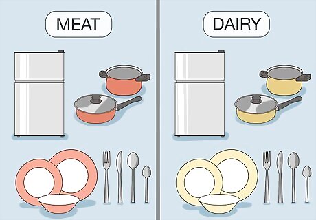 Keep your kitchen kosher. Very observant Jews take keeping kosher a step further by keeping their kitchen kosher. Having a kosher kitchen means that you keep two separate sets of dishes, silverware, napkins, and even refrigerators to serve or hold dairy and meat separately. Separate dishes and silverware for meat and dairy is the easiest step in keeping a kitchen kosher. Buy two separate sets of dishware to avoid confusion, can consider designating separate drawers and cupboards to meat and dairy dishes and cutlery. Don't use the oven for meat and dairy at the same time. You can use the stovetop to cook dishes involving meat and dairy on separate burners, but watch out for and clean up spills. Try not to microwave meat and dairy at the same time, since fumes from each dish can escape and infiltrate the other dish. Consider getting two dishwashers. Orthodox and very observant Jews often have two separate dishwashers which they use to separately wash any dishes or utensils that may have touched dairy or meat. Keeping your kitchen kosher ensures that you never run into a situation in which you may be eating dairy off a plate that held meat. Taking the measures to keep a kosher kitchen is complex and can be expensive, which is why the majority of Jews do not keep their kitchen kosher in this sense.
