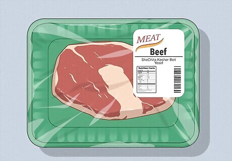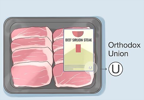 Purchase food with a kosher seal. As long as you know that a food is kosher, and if it's meat that it has been slaughtered in a way that adheres to the laws of kashrut, you don't need to buy food that has a kosher seal. However, buying food that has a certified kosher seal on it can make life a lot easier for you. If you live in a large city that has ample food options, or in a community that has a lot of Jews, you should have access to meat and foods that are marked as kosher. There are several types of kosher seals. Some kosher seals use the letter “K” for kosher or a “U” that stands for the Orthodox Union. The seal is usually under the product name or near the ingredients list on packaged foods. A lot of packaged food have kosher seals, but it may be harder to find kosher seals on meat unless you live in a heavily Jewish community. There may also be “parve” or “pareve” seal in addition to a “K” or “U” seal. Parve means “neutral” in Hebrew, and signifies that the food doesn't contain dairy or meat. When you see this seal, you know that you don't have to worry about pairing this food with dairy or meat.