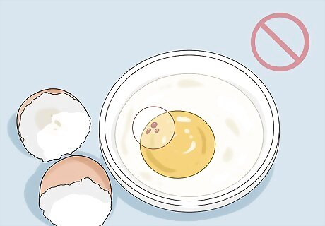Check eggs for blood before consuming. Eggs are kosher under the laws of kashrut as long as they are taken from chickens or other kosher animals. However, because the consumption of blood of any kind is not kosher, it's important to check your eggs for blood before cooking them. Crack individual eggs into separate bowls and look for blood traces before combining them with the rest of the food you are cooking. If you crack an egg with blood into a pot of food, you will contaminate the entire dish. Finding blood traces in eggs is relatively rare, but it's a good idea to always check each egg to be completely sure.