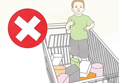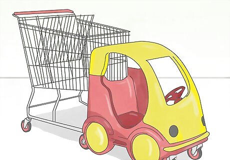 Choose child-specific carts. Many stores have special carts made for parents with small children. These carts are designed to be safer for the child by providing an area closer to the ground for the child to ride. If the store offers these carts, choose them instead. Often, these carts have a built-in plastic car attached to the front of the cart for the child to sit and play in.