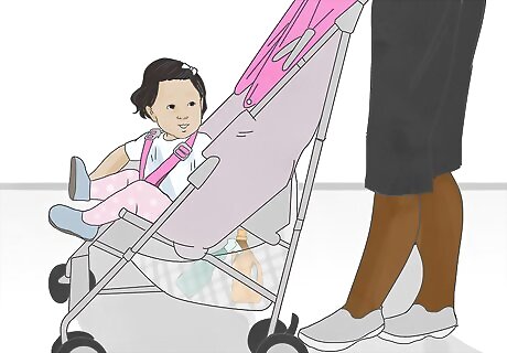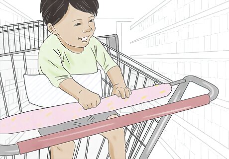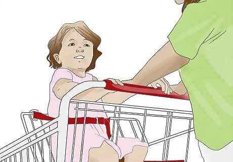 Use the safety belt. Many shopping carts come with a safety belt or harness attached to the seat. This device can help keep your child in the seat and prevent them from climbing or falling out of the cart when you are not looking. Make sure to secure the belt or harness so your child cannot slip out accidentally. If the cart has a broken or missing belt, choose another cart.