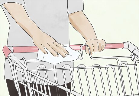 Disinfect the handle. Before you place your child in the child seat, take a moment to use a disinfectant wipe on the handle. You may also choose to wipe off the seat, too. Your child will place their hands on the handle, and those hands will automatically go in their mouths. Whatever germs are on the handle will be transferred to your child. Many supermarkets provide disinfectant wipes for you to use. If not, carry your own in your purse or baby bag. Studies have found that bacteria, including E. Coli and salmonella, can live on shopping cart handles.