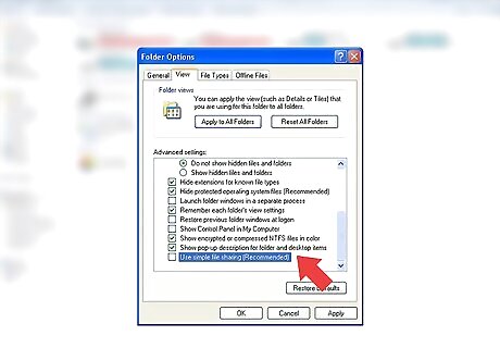 Turn off file sharing. Many programs that lead to illegal downloads are Peer-to-Peer (P2P) and use file sharing to make songs on one computer available to another. Disabling file sharing will save your computer from these harmful downloads with potential viruses. To disable file sharing, follow these steps: Click Start, My Computer Go into Tools Choose Folder Options Click View In Advanced Settings, click Use Simple File Sharing to clear the check box Click OK