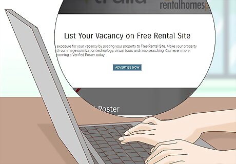List your property on FreeRentalSite.com. This site is used by renters to search for properties. When you go to the site, scroll down to the bottom of the homepage to find the section entitled “List Your Vacancy on Free Rental Site.” Click on the blue “Advertise Now” button. You will be redirected to a page with a form where you can enter all of the information about your property, including the address and a description. You will also be able to upload pictures. Become a “Verified Poster” by clicking on the blue “Get Verified” button at the bottom of the homepage. This means that your address and contact information have been confirmed by the site. It gives you more credibility with potential tenants who are searching the site for rental properties. Properties of verified posters are viewed two to three times more often than unverified listings.