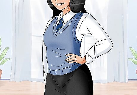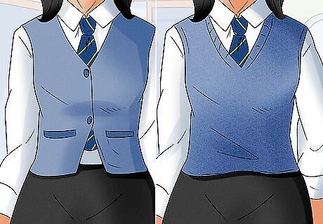 Throw something on over your shirt. Whether you have to wear a polo shirt, blouse, or button-down shirt, your school’s dress code policy may allow you to wear other clothing overtop, and this could give you an opportunity to add some style to your outfit. For instance, you could: Wear a fitted or oversized knit sweater over your shirt Put on a funky cardigan or vest Wear a fitted blazer or jacket