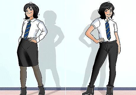 Swap out uniform pieces with similar clothes. For schools that are more lenient with their uniform policies, you may be able to get away with replacing drab and boring pieces of your uniform with very similar but slightly more flattering clothing items. For instance, if your uniform requires you to wear slacks or dress pants, you may be able to get away with regular pants in the same color that are a bit better fitting or have a different cut.