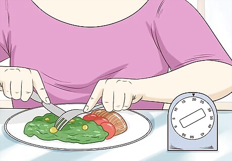Use mindful eating strategies to slow yourself down. Eating mindfully is a way to make yourself more aware of how much and what you are consuming. If you’re in the habit of eating quickly or eating while you’re distracted, such as while watching TV, try practicing some mindful eating techniques to help slow yourself down. Some strategies to try include: Creating a calm environment to eat your meals, such as at a table with no distractions. Eating with family or friends. Holding your spoon or fork in your non-dominant hand and setting it down between bites. Setting a timer for 20 minutes before you begin eating and pacing yourself so that you use the full 20 minutes to eat. Taking small bites, chewing each bite slowly, and focusing on the flavors.